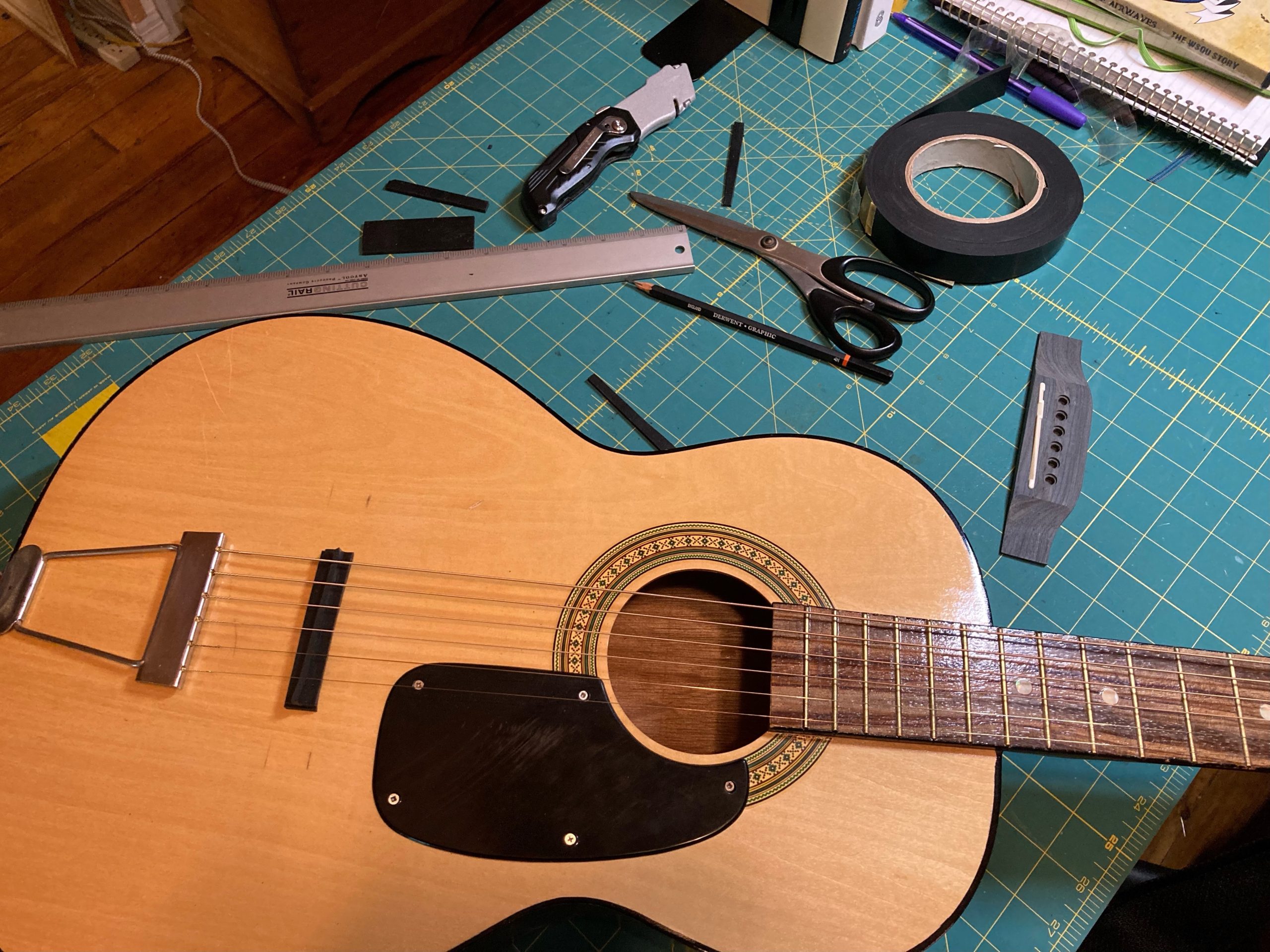 I’ve already done a bit of work on this guitar, including cleaning up the frets and swapping out the original bridge in order to lower the action (how high the strings are from the fretboard) to make it more playable. I wasn’t happy with the changes I made as the action was still too high. This rubber bridge idea gave me a path to fixing the action problems.