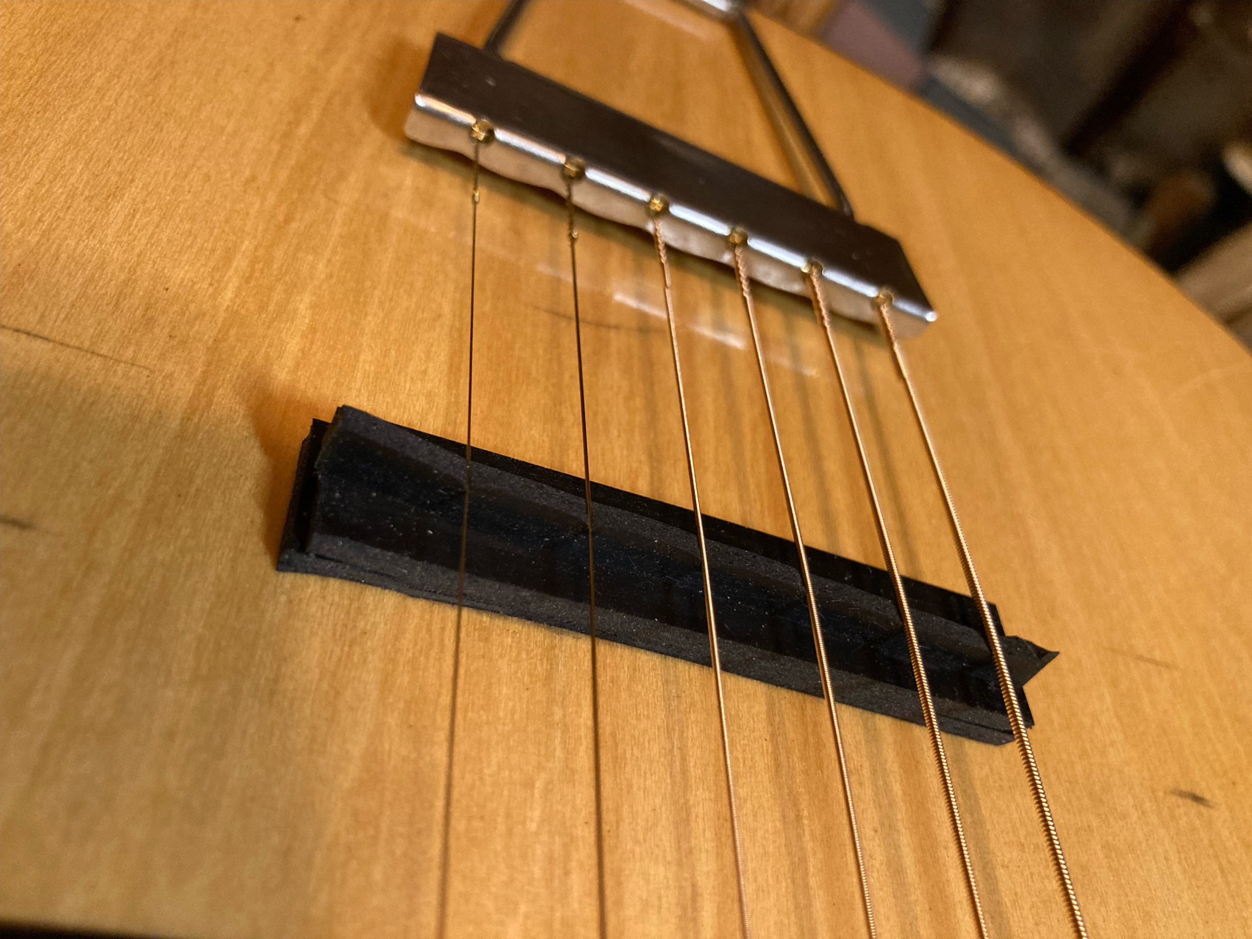 Adding the new bridge took a little trial and error. First I just cut bridge-width strips of rubber off the roll. 1/8th inch wasn’t enough, but ¼ inch was about right. I installed it, tuned the guitar and played.